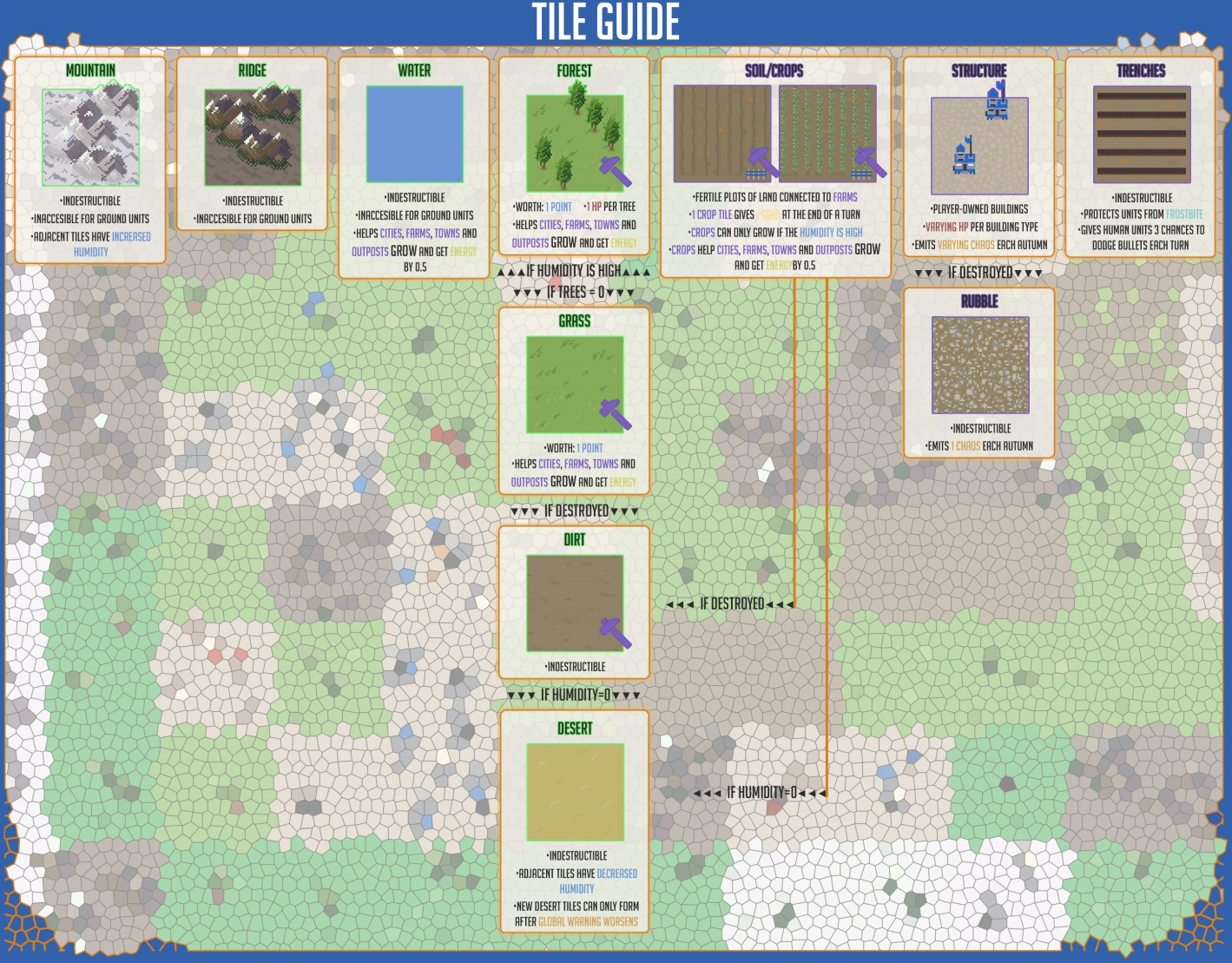 Terrain tiles can be divided into two categories: Indestructible tiles and destructible tiles. Destructible tiles can be changed by building on them, or they can change automatically due to changes in humidity.